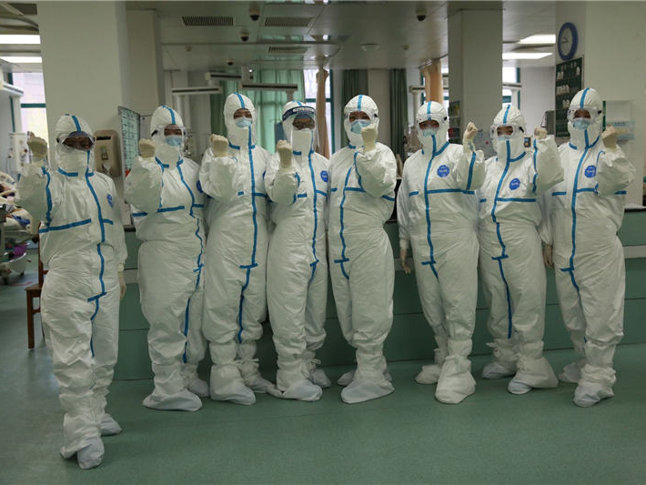 1月24日,武汉市红十字会医院,前来增援的协和医院医生和武汉市红十字会医院一起加油鼓劲,向疫情宣战。(湖北日报全媒记者柯皓摄)