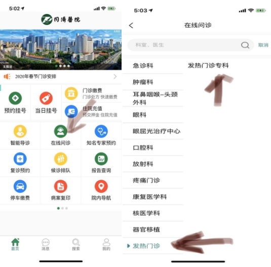 下载同济医院官方APP“掌上同济”或同济医院官方微信公众号在线问诊功能,查询“发热门诊”相关专家,描述病情症状和问诊诉求,发起健康咨询,专家将在线尽快解答。