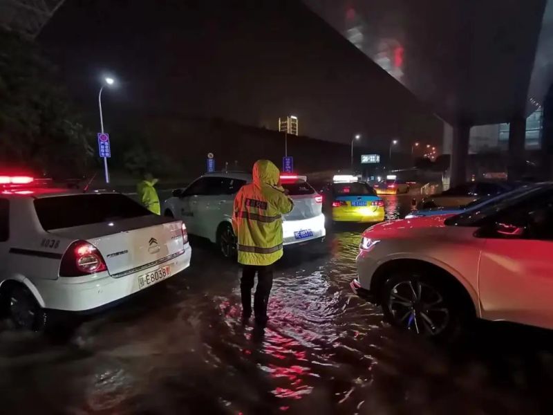 火车东站同强路隧道处积水严重,交警支队伍家大队为保道路安全畅通,主动出击,增派警力赶往现场维护交通。