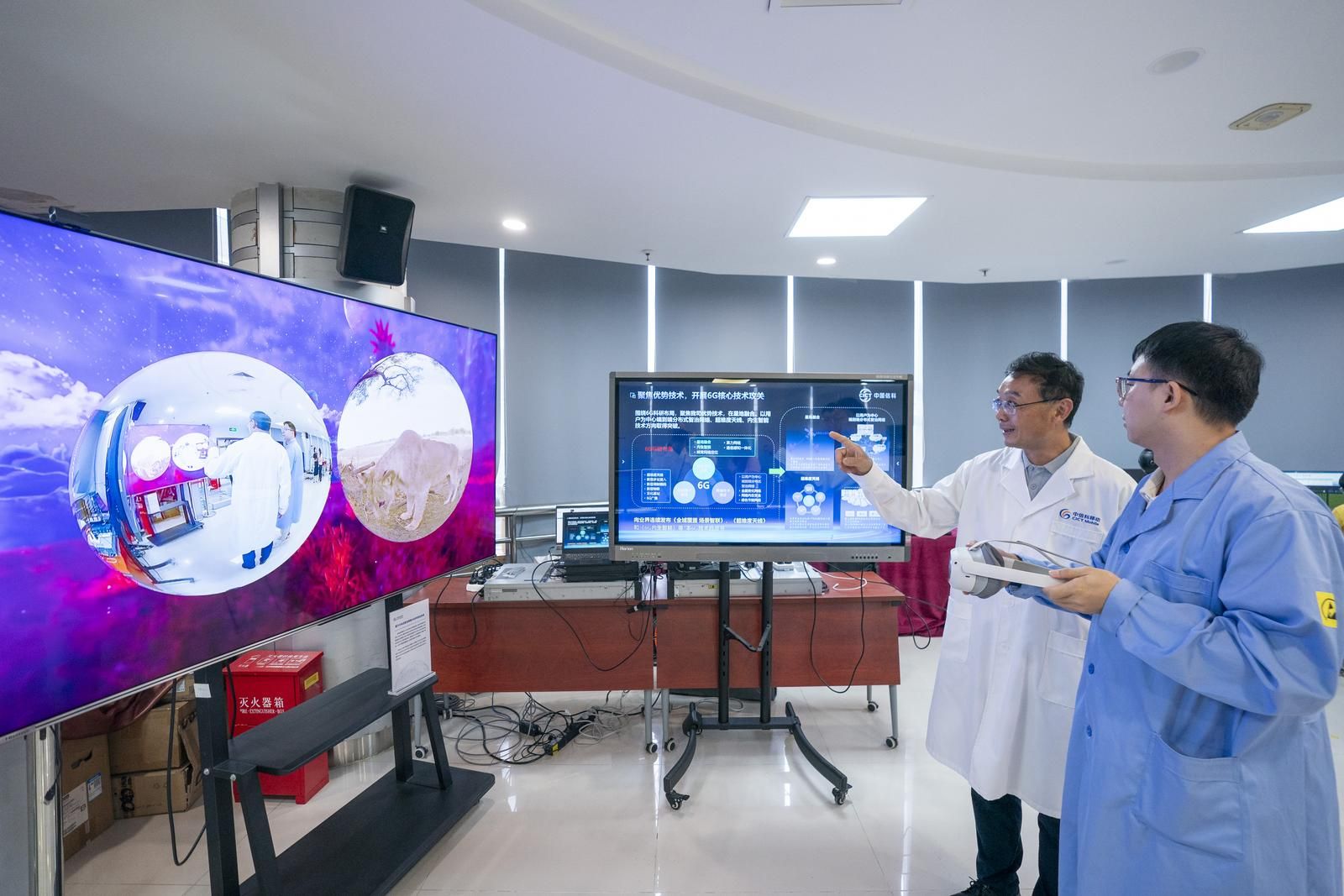 中信科移动研发中心,首席科学家孙韶辉(左)与研发人员讨论6G全息沉浸式通信业务的技术细节。(湖北日报全媒记者 魏铼 摄)