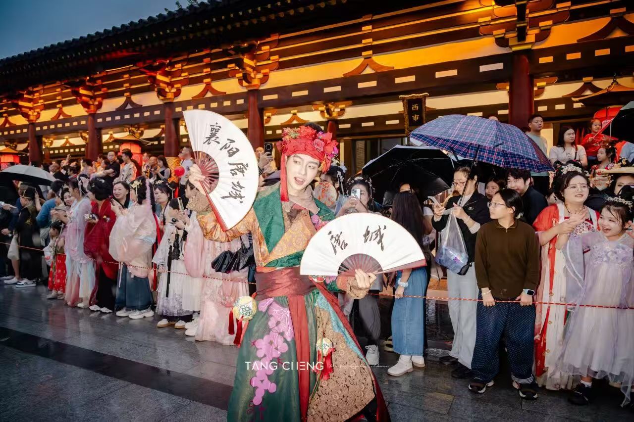 文旅企业的积极参与,让这场盛会的体验维度更加丰富。襄阳旅游年票现场销售,襄阳华侨城奇幻度假区工作人员向过往游客推介当季主打文旅产品——云海汤泉。尧治河旅游度假区的大厨参与厨艺比拼,为游客现场烹饪拿手菜。唐城不仅带来了新潮有趣的文创产品,景区行走的IP“唐城将军”更是与一众NPC人物巡游,与游客互动。