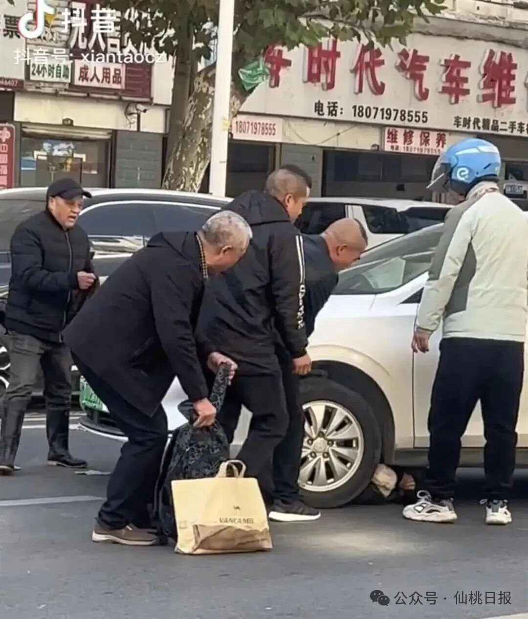 网友拍摄:众人一起抬车救人