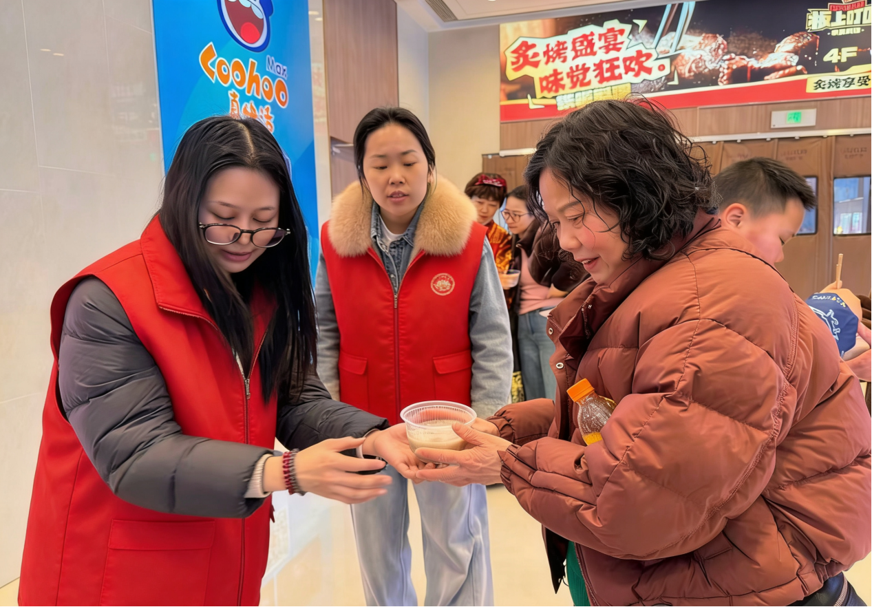活动当天,吾悦广场雅斯超市门口的免费发放点格外热闹。红色的横幅迎风飘扬,志愿者们早早到位,将一碗碗煮好的汤圆整齐摆放,浓郁的香甜气息弥漫在空气中。发放现场,秩序井然,前来领取汤圆的女性从业者们脸上洋溢着喜悦。无论是刚下早班的营业员,还是清扫完片区的保洁阿姨,接过热气腾腾的汤圆时,都能收获一句暖心的问候:“元宵节快乐,您辛苦了!”